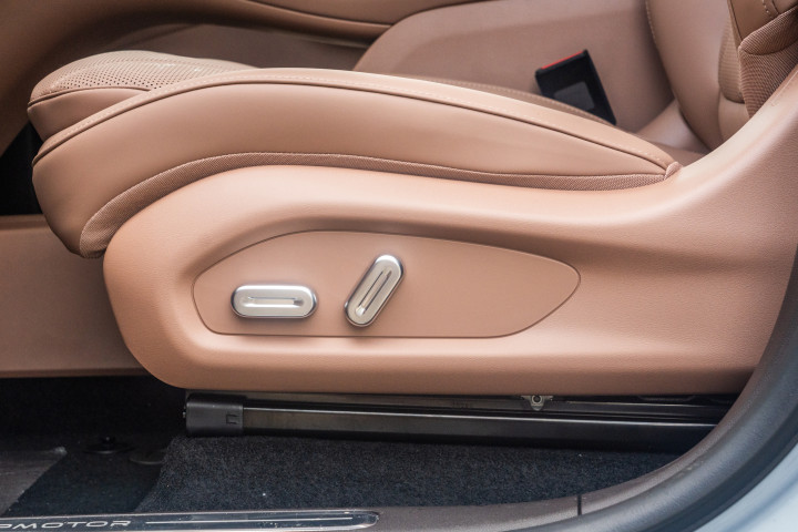 值得一提的是,主副驾座椅支持电动调节,整体支持前后移动+靠背角度+高低调节。二排座椅的坐垫有一定的倾斜,对于腿部的支撑足够,坐在上面,有“陷进去”的舒适感。