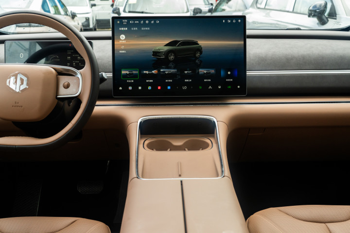 进入车内,C11的内饰颜色很年轻化,墨绿紫色的颜色搭配提升了车内的质感,车内看不到任何的物理按键,很是简洁。中控台区域搭载了双辐式平底方向盘、17.3英寸悬浮式中控屏,10.25英寸的仪表盘以及10.25英寸的副驾驶娱乐屏组成的三屏,大大提升了车内的科技感。同时,该车还采用了电子式怀挡设计,中控屏下方比较整洁。